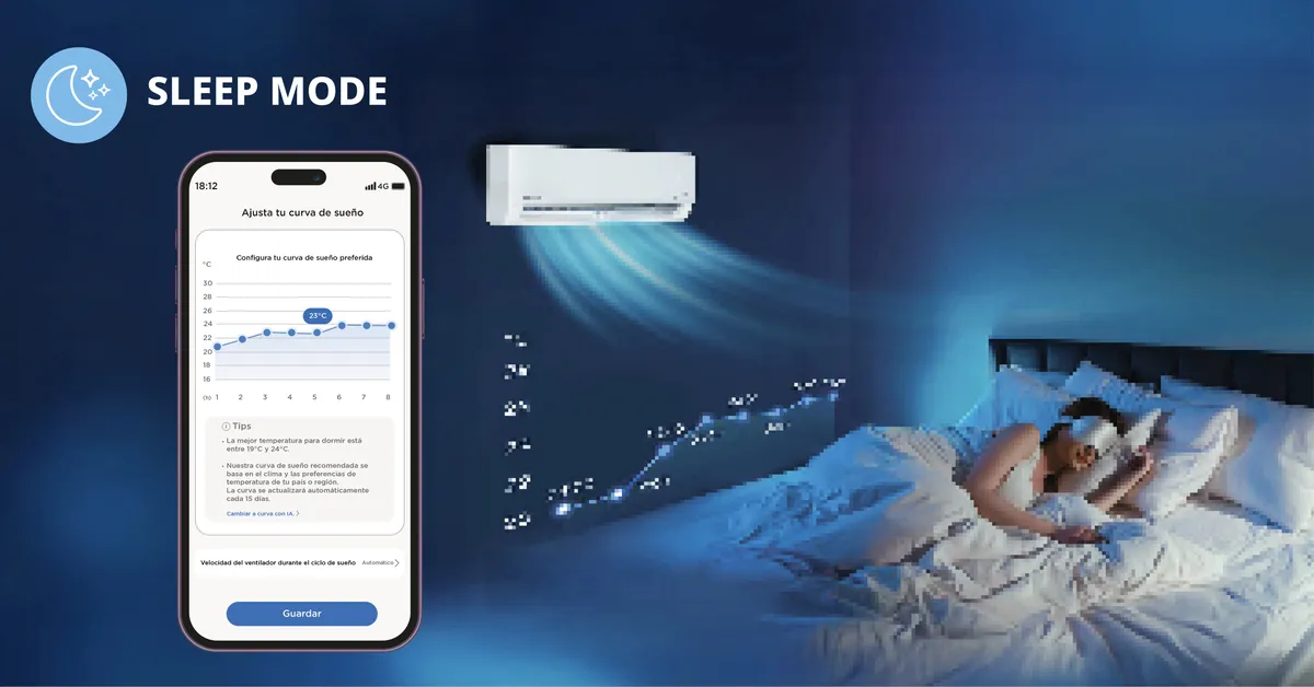Temperatura ideal para un descanso óptimo. Al activar el modo Sleep, el equipo reduce el ruido de funcionamiento y controla la temperatura según el seteo de tu ventana de sueño. Logrando un ambiente ideal, sin brisa, silencioso y en la temperatura correcta.